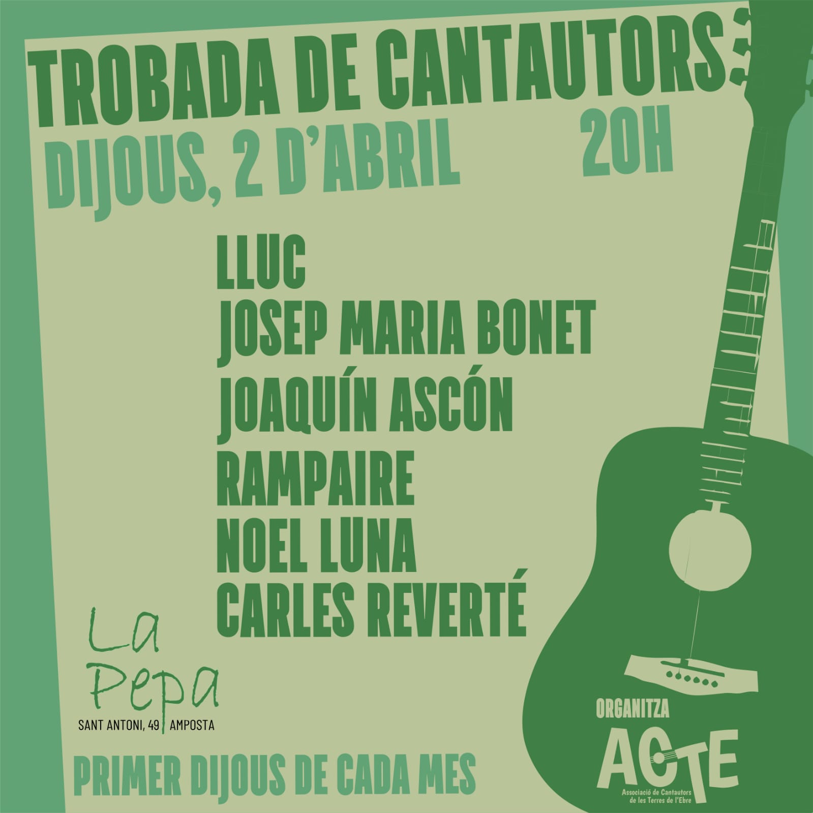 Aquest dijous 2 d’abril a les 20 h, l’espai La Pepa d’Amposta acull una nova trobada de cantautors amb actuacions de Lluc, Josep Maria Bonet, Joaquín Ascón, Rampaire, Noel Luna i Carles Reverté.