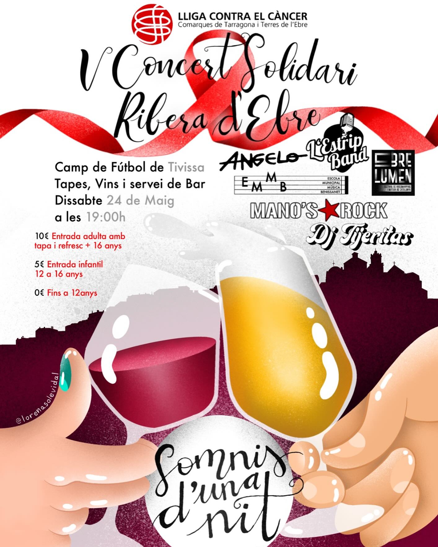 Aquest dissabte 24 de maig a les 19:00 h, el camp de futbol de Tivissa serà l’escenari del V Concert Solidari Ribera d’Ebre, organitzat per la Lliga contra el Càncer de les Comarques de Tarragona i les Terres de l’Ebre. L’acte comptarà amb tapes, vins i servei de bar, i oferirà les actuacions d’Angelo, L’Estrip Band, Ebre Lumen, EMB, Mano’s Rock i DJ Tjentis. Les entrades tenen un cost de 10 € per als majors de 16 anys (amb tapa i refresc), 5 € per a joves de 12 a 16 anys i són gratuïtes per als menors de 12 anys. Un vespre ple de música i solidaritat sota el lema “Somnis d’una nit”.