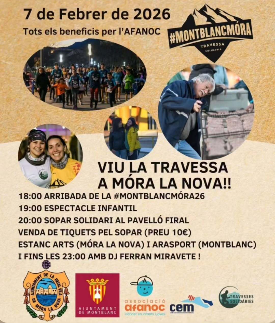 La travessa solidària #MontblancMóra, que se celebrarà el 7 de febrer de 2026 a Móra la Nova, amb tots els beneficis destinats a l’AFANOC. La jornada combina esport, solidaritat i festa: a les 18 h hi haurà l’arribada de la travessa, seguida d’un espectacle infantil a les 19 h i un sopar solidari a les 20 h al Pavelló Firal. La nit acabarà amb música fins a les 23 h amb DJ Ferran Miravete. Un esdeveniment pensat per a tots els públics, per gaudir i col·laborar per una bona causa.