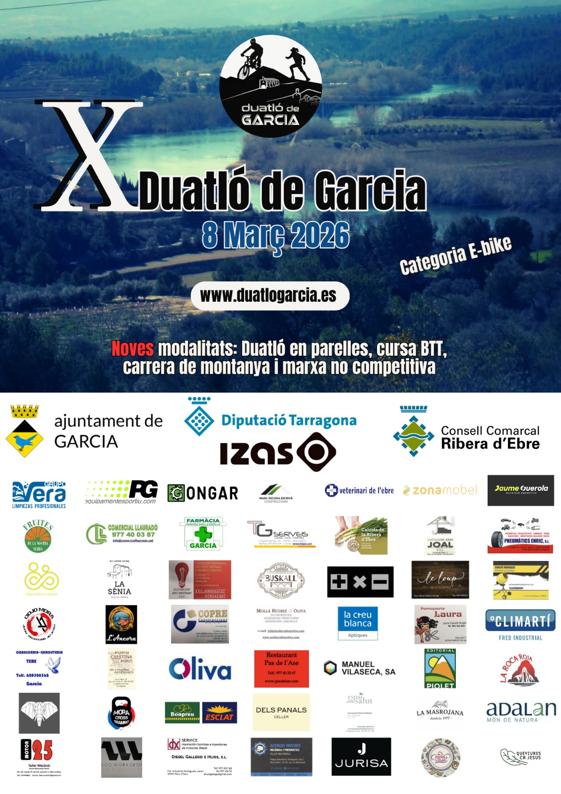 Duatló de Garcia 2026 a Garcia reuneix diverses proves el 8 de març, des de Marxa 10 km fins a Duatló per parelles 51 km. El preu publicat és 25 € per prova i existeix un reglament oficial.