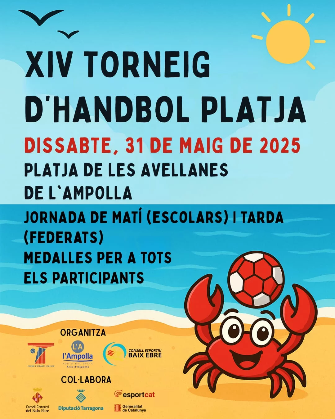 El proper dissabte 31 de maig de 2025, la Platja de les Avellanes de l’Ampolla acollirà el catorzè Torneig d'Handbol Platja, amb una jornada plena d’esport i diversió. Els partits es disputaran al matí per a escolars i a la tarda per a federats. Tots els participants rebran medalles com a reconeixement.