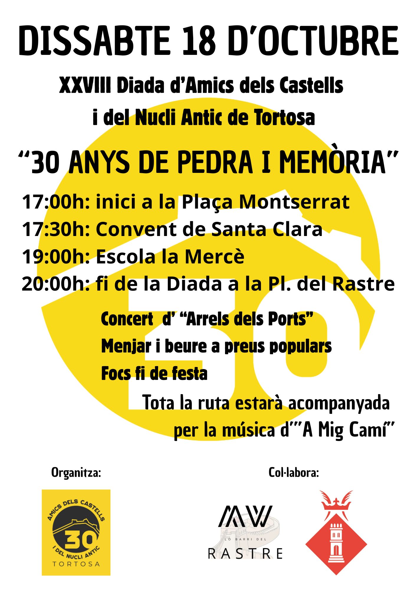 El proper dissabte 18 d’octubre de 2025, a partir de les 17h, se celebrarà la XXVIII Diada d’Amics dels Castells i del Nucli Antic de Tortosa sota el lema «30 anys de Pedra i Memòria». L’activitat recorrerà la Plaça Montserrat, el Convent de Santa Clara i el barri del Rastre, mostrant racons històrics poc coneguts, amb música en directe d’A Mig Camí. La jornada finalitzarà a la Plaça del Rastre amb menjar i beure a preus populars, el concert d’Arrels del Ports i un petit castell de focs per celebrar els 30 anys de l’associació.
