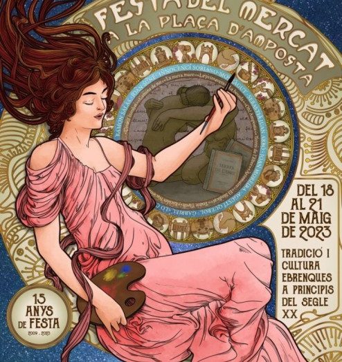 Com els últims anys, el cartell segueix una línia modernista, inspirada amb els cartells de l’artista txec Alphonse Mucha, considerat un dels màxims exponents de l’Art Nouveau. Un estil que se centra en una figura femenina com protagonista, representant aquesta idea icònica de la dona com a deessa. En el cas d’enguany, la dona representa l’art, amb una paleta i un pinzell. La resta d’elements inclosos fan referència a detalls de les arts d’Amposta i el territori. Així, surten noms Sebastià J. Arbó, Joan Suñé o Innocenci-Soriano Montagut i referències a obres d’aquests artistes.