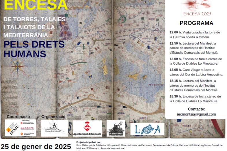 El pròxim dissabte 25 de gener, Amposta participarà, per quart any consecutiu, en l’encesa de torres, talaies i talaiots de la Mediterrània. Aquesta iniciativa, impulsada per l’Institut Ramon Muntaner i amb el suport del Departament de Cultura de la Generalitat, la Coordinadora de Centres d’Estudis de Parla Catalana i la Federació d’Ateneus de Catalunya, reivindica els drets humans i transforma aquestes estructures històriques en símbols de llum i acollida.