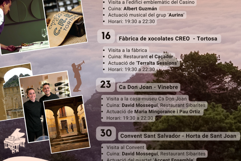 Impulsada pel departament d’Acció Climàtica, Alimentació i Agenda Rural, el departament de Cultura i el Consorci de Polítiques Ambientals de les Terres de l’Ebre (COPATE), la iniciativa consisteix en l’organització de quatre sopars en espais patrimonials, amb productes i productors de proximitat i actuacions musicals.
